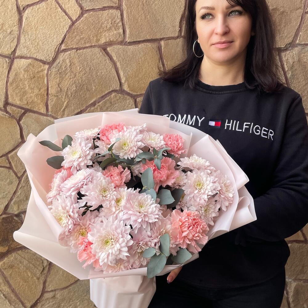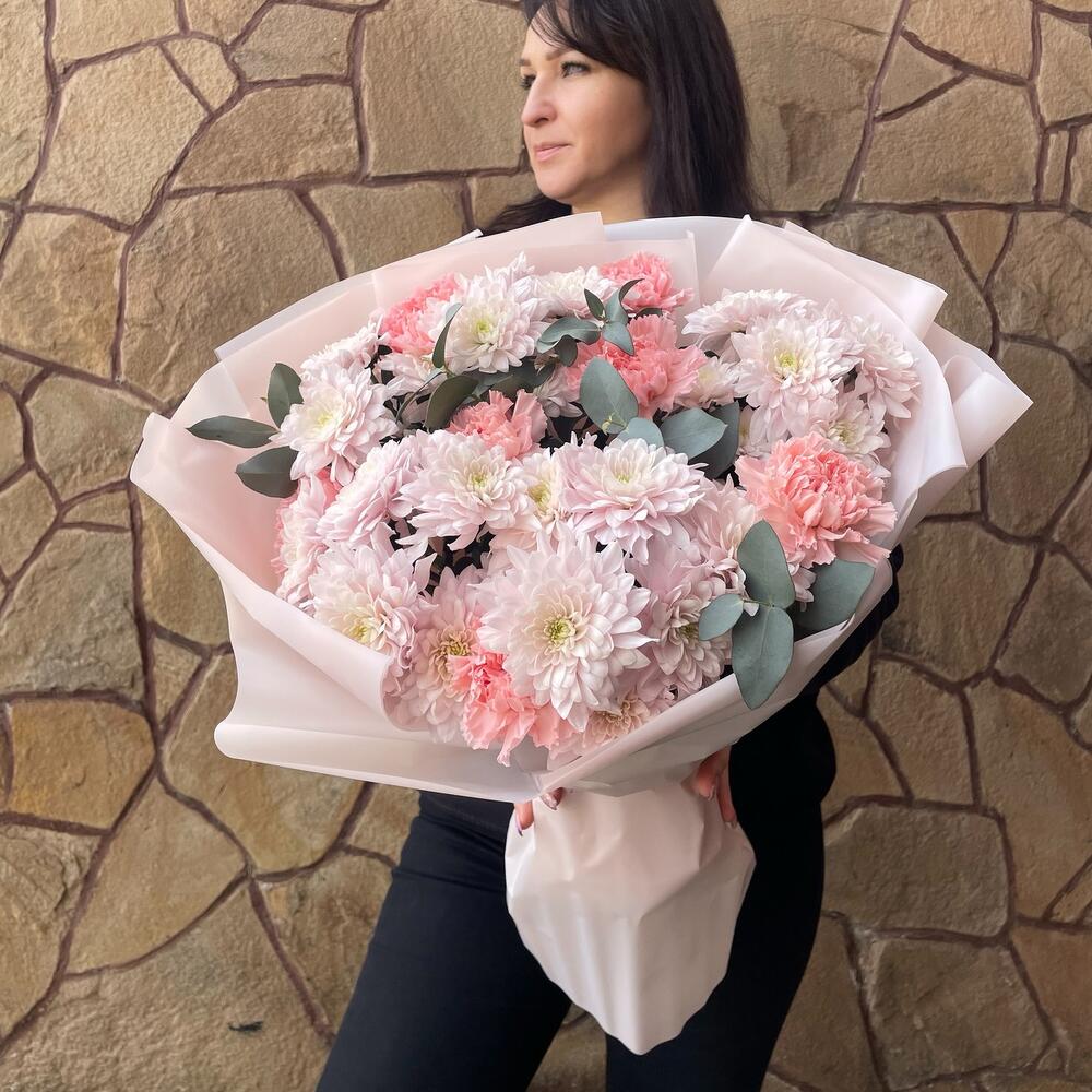 Авторский букет из хризантем , эвкалипта и диантусов в Тихвине